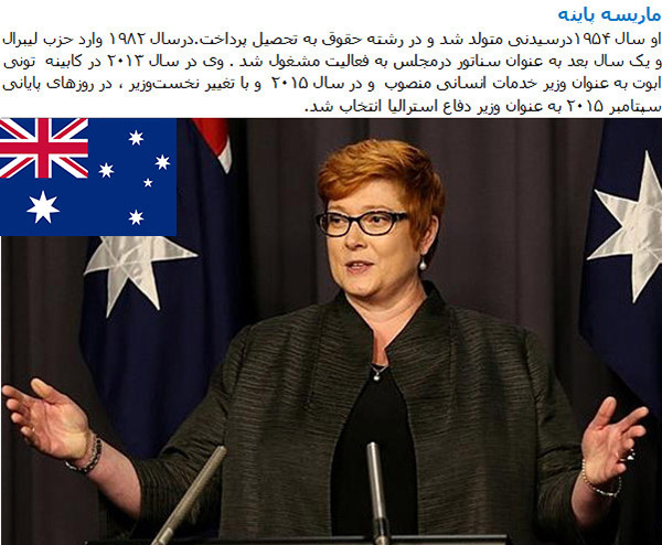 Marise Ann Payne was born 1964 is an Australian politician. She is a Liberal Party Senator for the state of New South Wales. Senator Payne was appointed to the Senate on 9 April 1997, and elected in 2001 for a full term, and again in 2007 and 2013. Payne was promoted to cabinet as Australia’s first female Minister for Defence, in the Turnbull Government, on 21 September 2015.