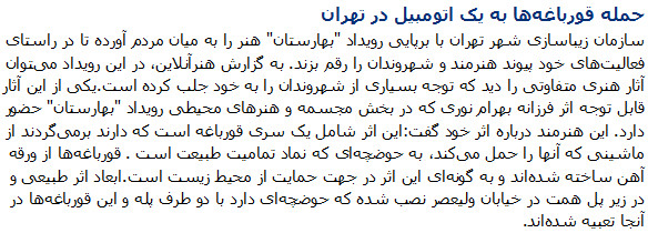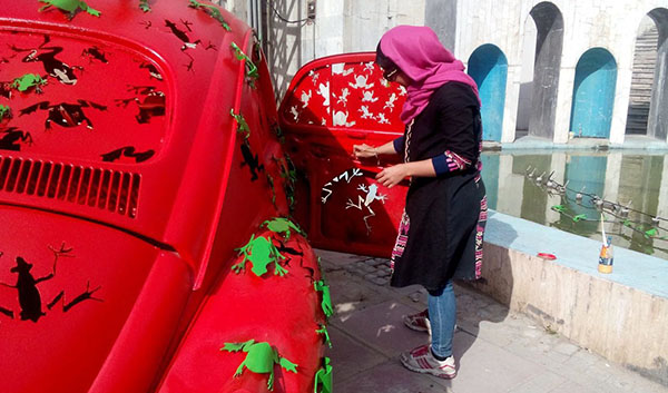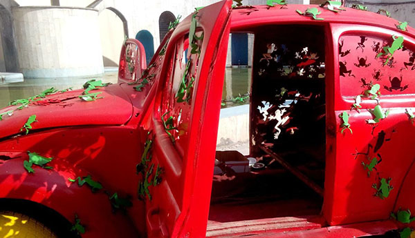 Capital Beautification Organization held an event “Baharestan” has brought art to the people to bring their activities bringing artists and citizens.The artist said his work: The work consists of a series of straps that are returning from a machine that carries them, to pond the symbol of the integrity of nature. These frogs made of iron sheets and so this relic support the environment.
