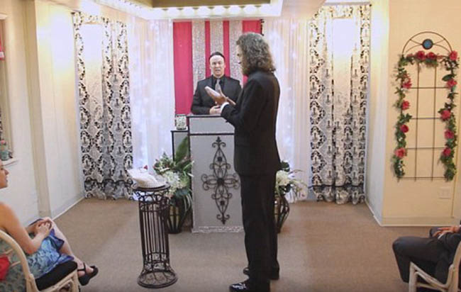 Cool ride: The groom arrived at The Little Vegas Chapel in a vintage pink car.Aaron put on a suit coat before driving himself to the chapel in a bubblegum pink car with his smartphone in tow. Inside, his black iPhone was dressed in a white case and perched on a decorated stand, which was placed next to him in the front of the chapel. There were even a few guests at the bizarre nuptials.