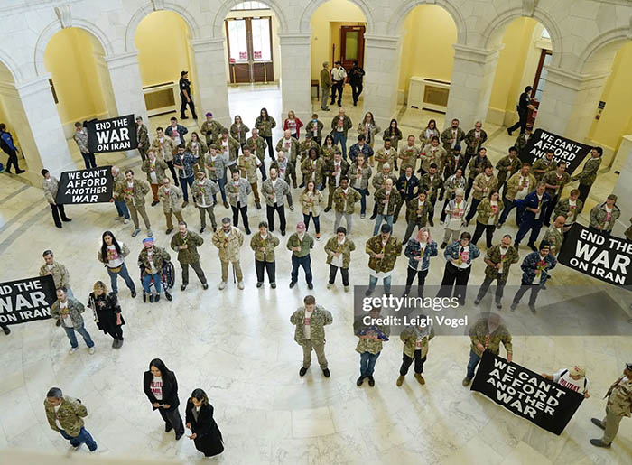Chants such as “No War with Iran” and “Veterans for Peace” echoed through the halls, drawing attention from lawmakers, staff, and media outlets.